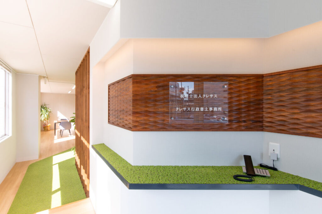 また、木製の格子パネルはこの空間の象徴的な存在です。一見すると壁のように見えながら、角度によっては多くの隙間から自然光が差し込む設計とし、閉塞感を与えることなく空間の奥行きを演出。士業の専門性にふさわしい落ち着きと信頼感を軸にしつつ、来訪者とやさしくつながる場となるようデザインされています。