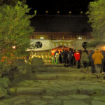 早朝ならではの張りつめた空気と、境内の灯りが印象的で、
